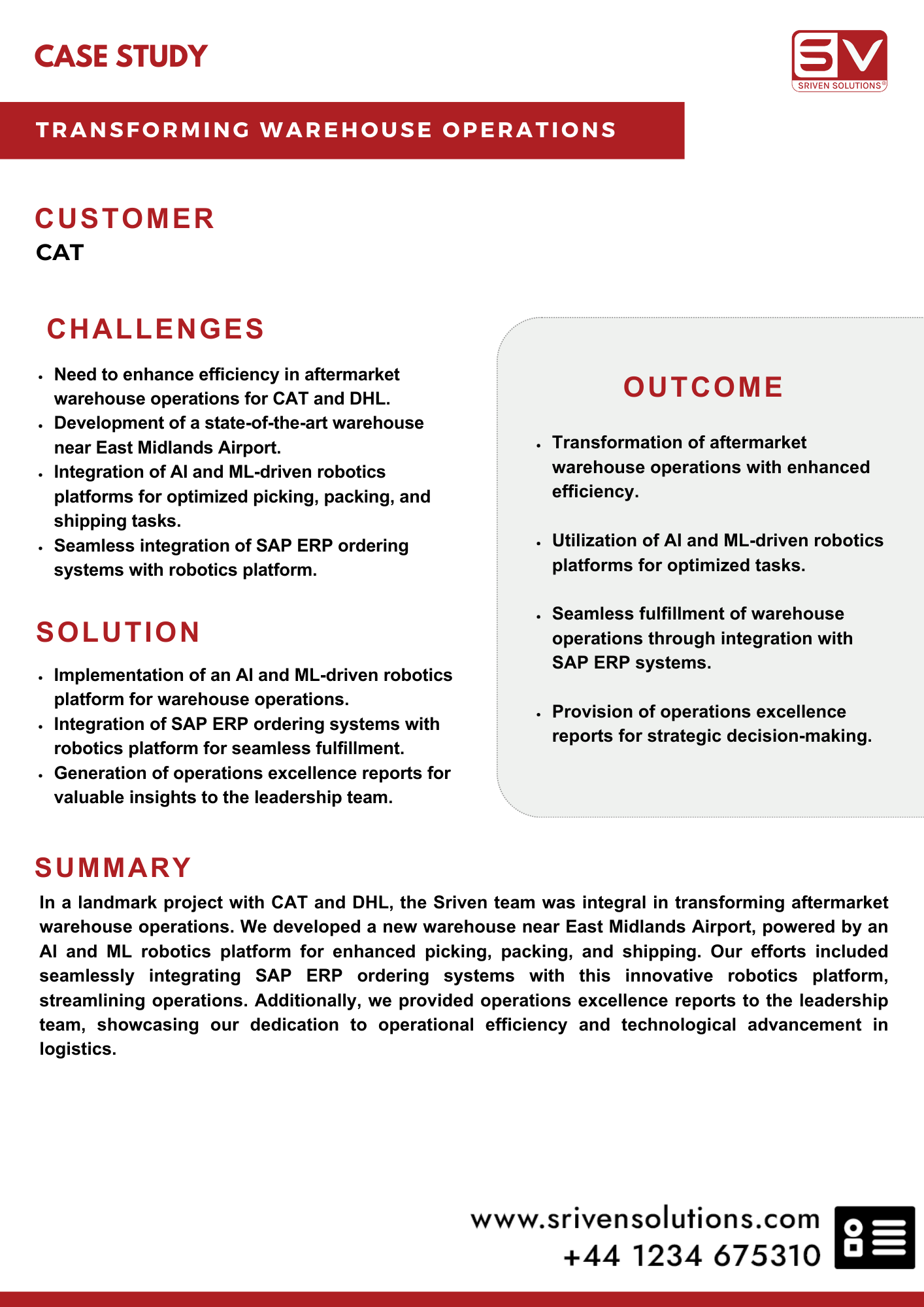 In a landmark project with CAT and DHL, the Sriven team was integral in transforming aftermarket warehouse operations. We developed a new warehouse near East Midlands Airport, powered by an AI and ML robotics platform for enhanced picking, packing, and shipping. Our efforts included seamlessly integrating SAP ERP ordering systems with this innovative robotics platform, streamlining operations. Additionally, we provided operations excellence reports to the leadership team, showcasing our dedication to operational efficiency and technological advancement in logistics.